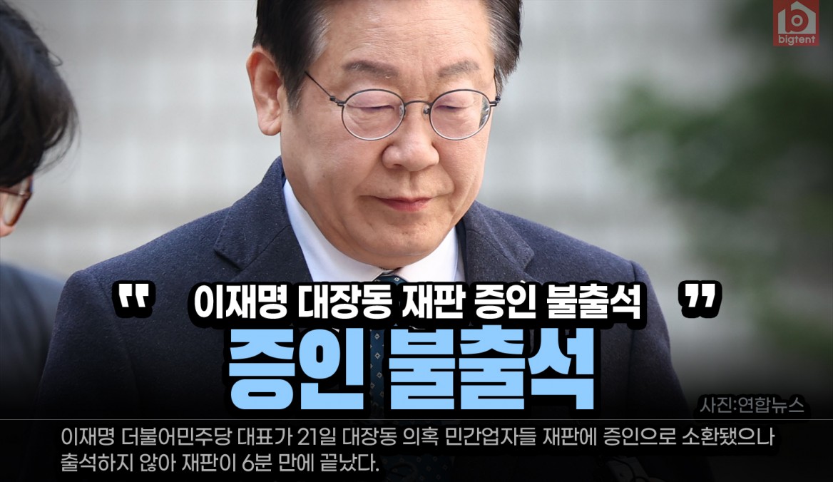 이재명 더불어민주당 대표가 21일 대장동 의혹 민간업자들 재판에 증인으로 소환됐으나 출석하지 않아 재판이 6분 만에 끝났다.
