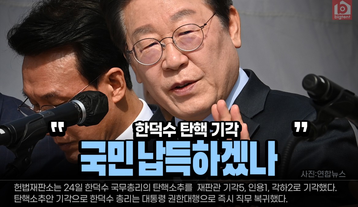 이재명 민주당 대표, 헌재의 판단 존중하지만 한덕수 탄핵 기각, 국민납득하겠나빅텐트[팀민주]----------------------------------------------------