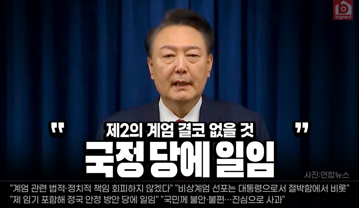 윤석열 대통령 대국민담화"계엄 관련 법적·정치적 책임 회피하지 않겠다""비상계엄 선포는 대통령으로서 절박함에서 비롯""제 임기 포함해 정국 안정 방안 당에 일임""국민께 불안·불편…진심으로 사과""국정운영은 국민의힘에 일임"빅텐트[보도방]--------------------------------------------