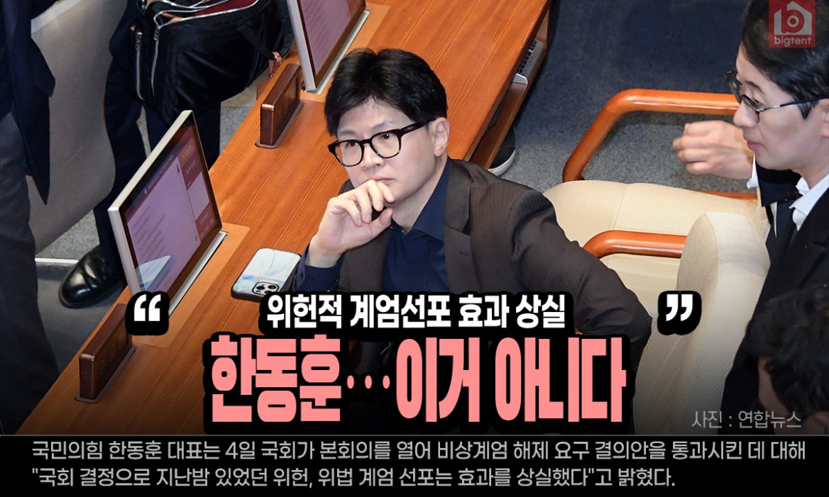 한 대표는 "국회의 계엄 해제 의결로 이번 계엄 선포는 실질적인 효과를 상실했다"며 "그렇기 때문에 지금 계엄령에 근거해서 군경이 공권력을 행사하는 것은 위법한 것"이라고 말했다.